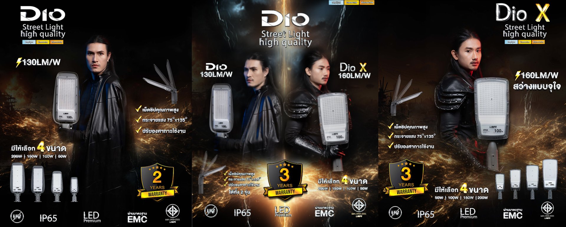 โคมไฟถนน LED รุ่น DIO X มาตรฐาน IP65 สว่างทุกเส้นทาง ด้วยแสงคมชัด ปรับทิศทางแสงได้ตามต้องการ ทนแดด ทนฝน 100% ด้วยระบบกันน้ำระดับ IP65 ให้ความสว่างที่มากขึ้น ประหยัดพลังงาน เหมาะกับทุกสภาพแวดล้อม